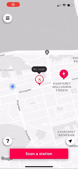 On the homepage of the app, the user will see a map featuring the locations of where Brick stations can be found. There are a couple of additional data points shown in the app as well, such as the venue, station, and powerbanks.