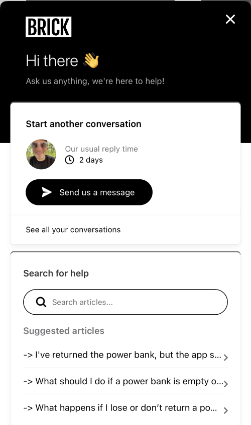 If you encounter any issues with the station, powerbank, or payment, don't worry! You can easily reach out to our customer support team through the dedicated section in the main menu of the Brick App.