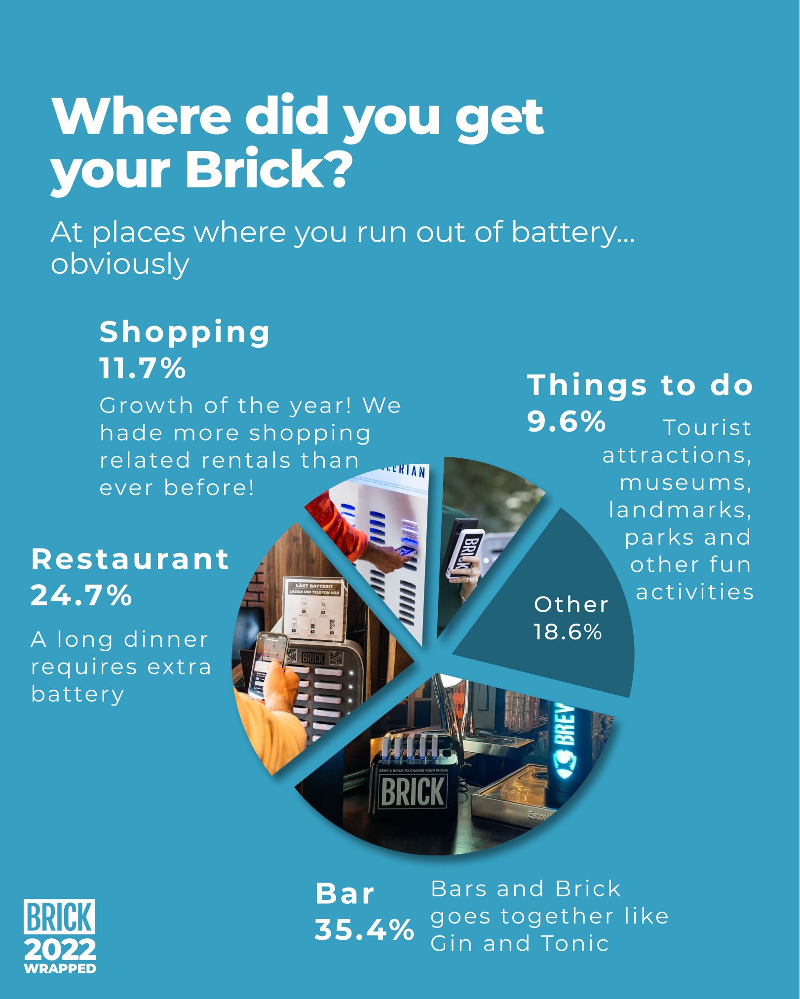 Most Bricks was rented at bars and restaurants, which is two of our most popular places to place a station. We also so a growth in rentals when you where out shopping. What our most popular places have in common are that it's were you stay for a long time and might need your phone to reach friends, pay or take pictures.