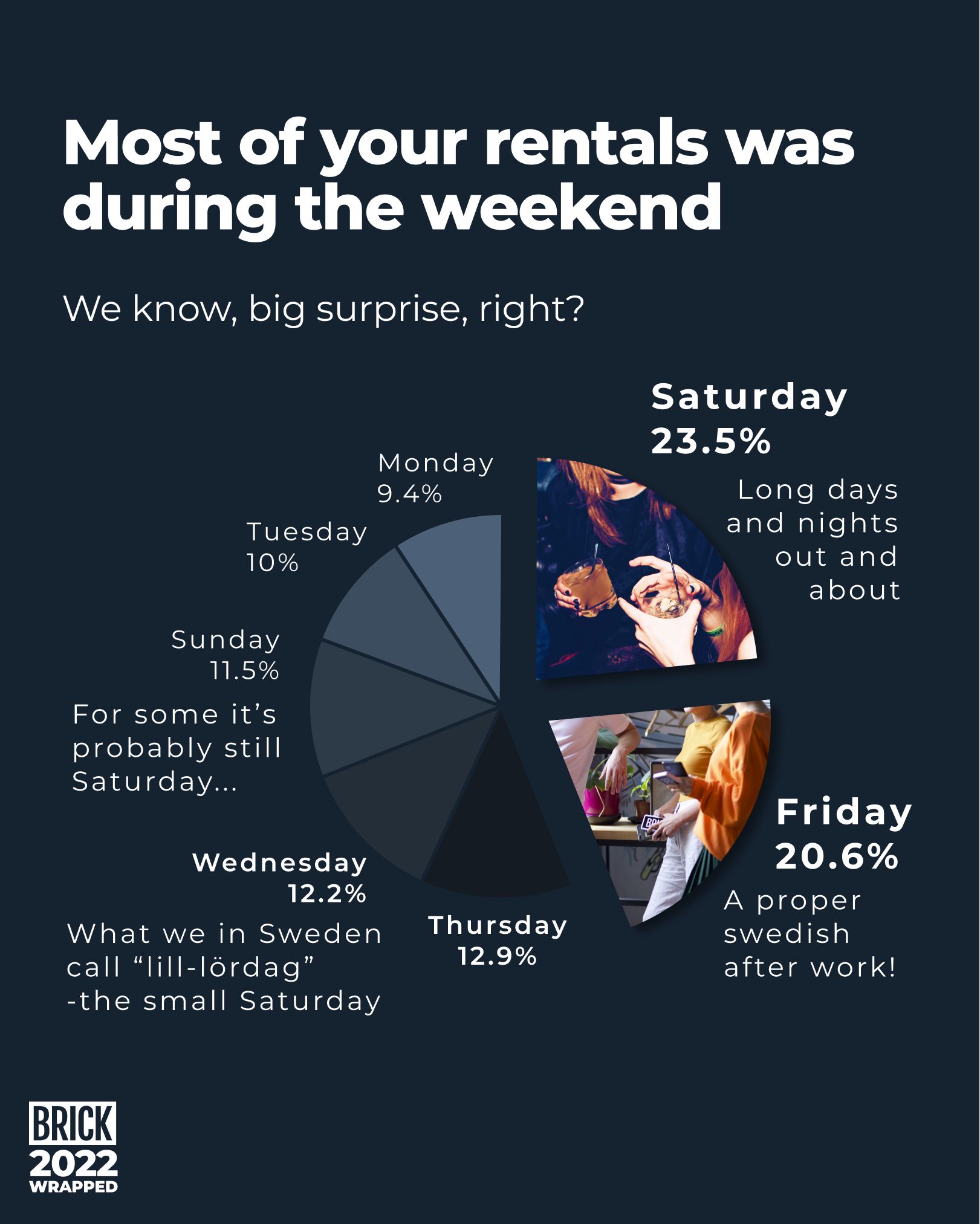 To the surprise of no one, Saturday and Friday was the top days to rent a Brick powerbank! Being out late after work on Fridays and possibly most of the day on Saturday can drain your battery. That's when you need powerbank sharing!