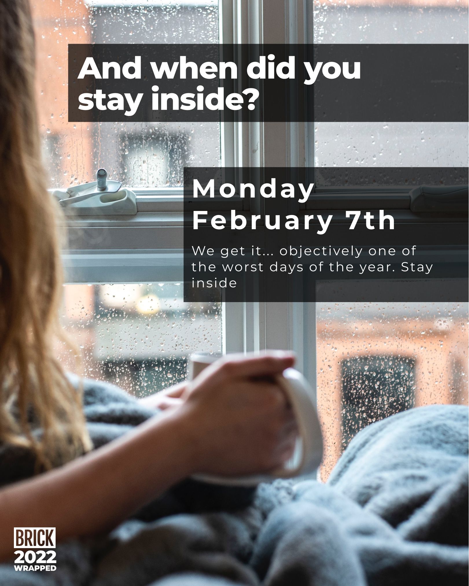 The least popular day to rent a Brick powerbank was February 7th. We totally understand that you want to stay inside and that you have all. the warmth and charging you need at home. Good for you!