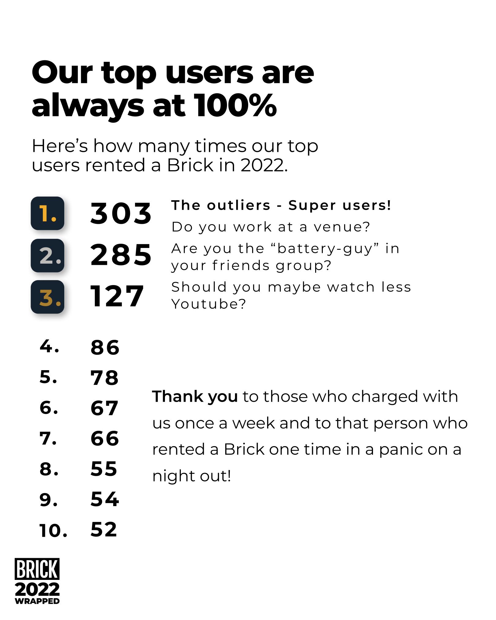 The top users are a bit of outliers statstically. They might be working at a venue who has Brick and are properly onboarded. They might also be helping their friends with extra battery or are using their phones a lot. In any case we appreciate all our users!